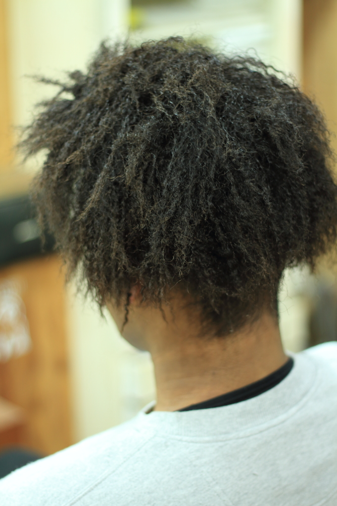 (コームツイストドレッド用のパーマ(アフロ)をかけ→解し→コームを使いツイスト(クルクルとねじる)していく)